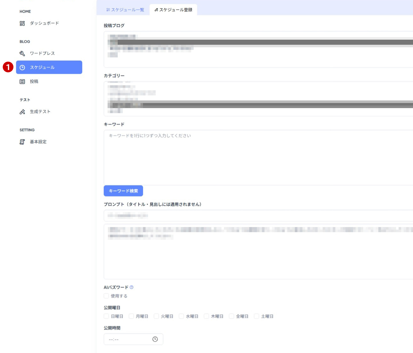 | 公開曜日 | 投稿を公開したい曜日をチェックしてください。 投稿は1日1投稿なので、チェックしていない曜日は別のキーワード設定での投稿も可能です。 例えば、キーワードAの設定で「月火水」、キーワードBの設定で「木金土日」ということもできます。 |
