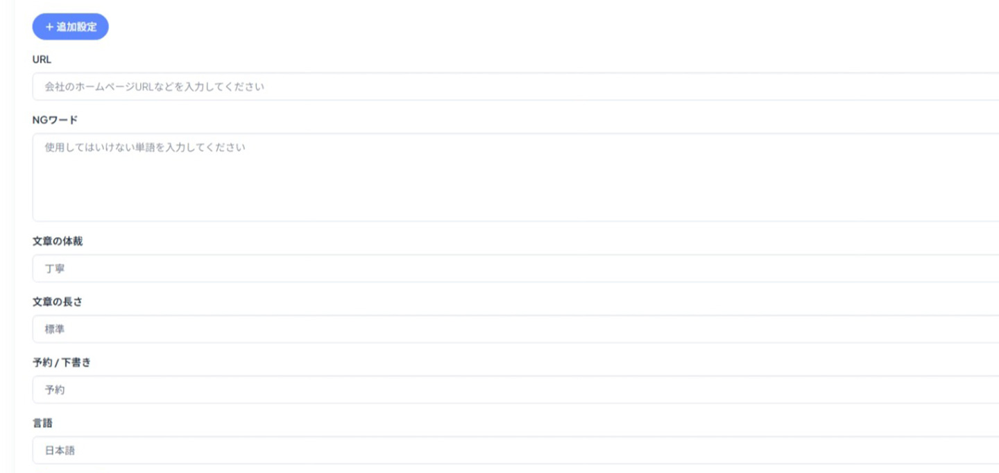 | 文章の体裁 | 生成記事のテイストを選択できます。 【選択肢】